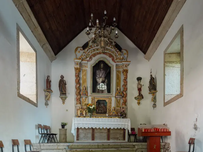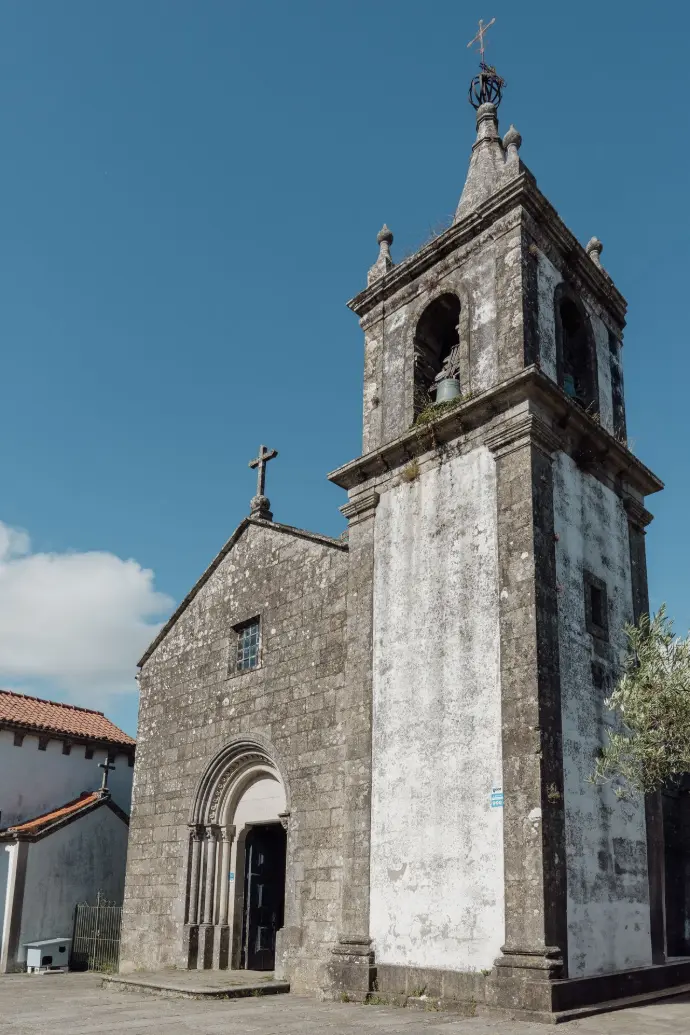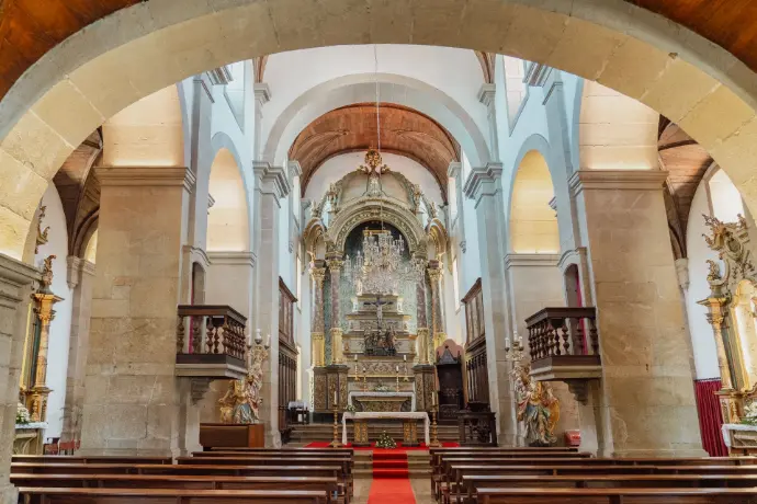 Construída em 1276, no século XIII, apresenta uma planta longitudinal composta por nave única, capela-mor e torre sineira. No interior, destacam-se os retábulos e a vista privilegiada para a Capela das Carlas, que confere profundidade e valor artístico ao conjunto.