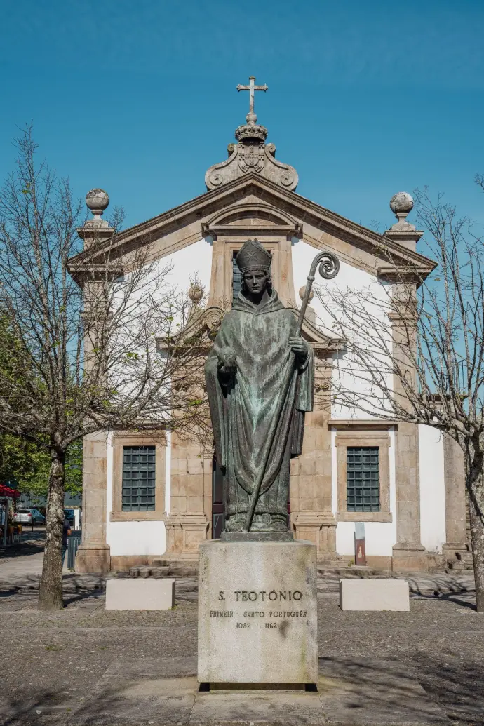 Esta escultura do século XX presta homenagem a São Teotónio, figura maior da espiritualidade portuguesa e símbolo da identidade nacional. Nascido em 1082, na freguesia de Ganfei, em Valença, e falecido em Coimbra a 18 de fevereiro de 1162, foi o primeiro português a ser canonizado, apenas um ano após a sua morte, pelo Papa Alexandre III.